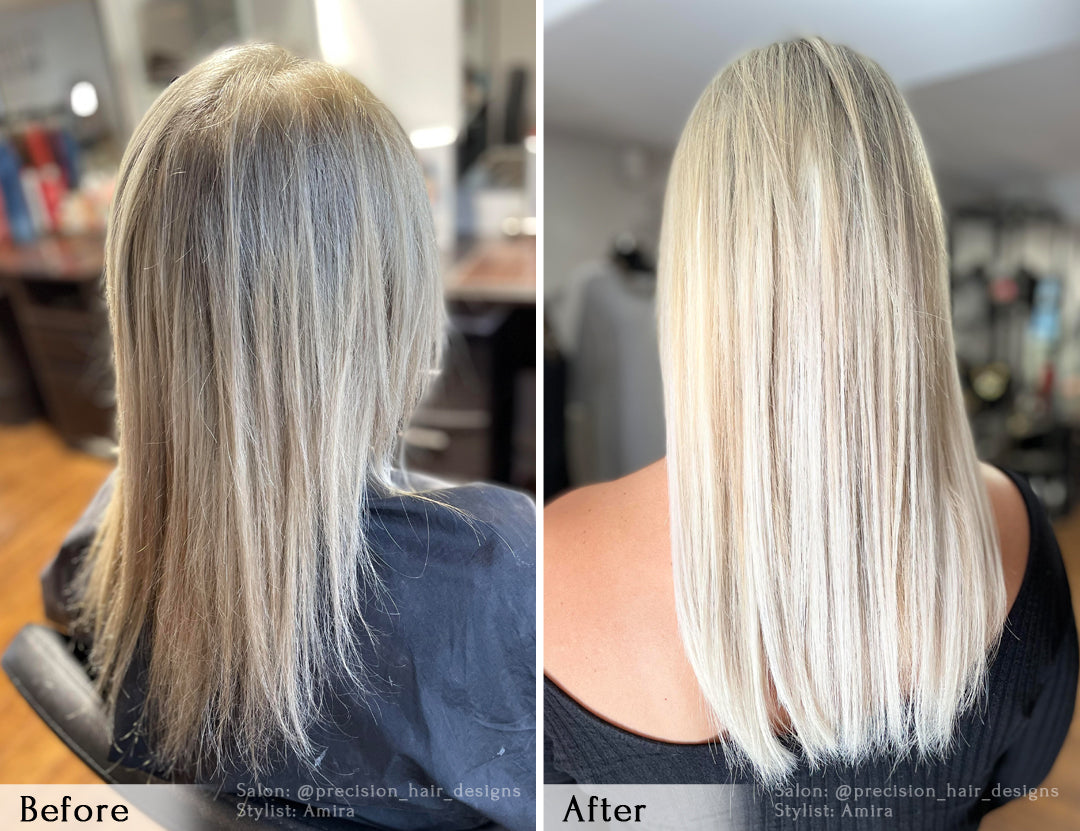 Amira installed the Fantsy Tape-In Extensions in #60 then toned with Blacklight Purple shampoo. Afterwards she brick layered her hair for more fullness. This is Kelsey's (customer) 3rd time using Fantsy Tape-In's and she LOVES them!