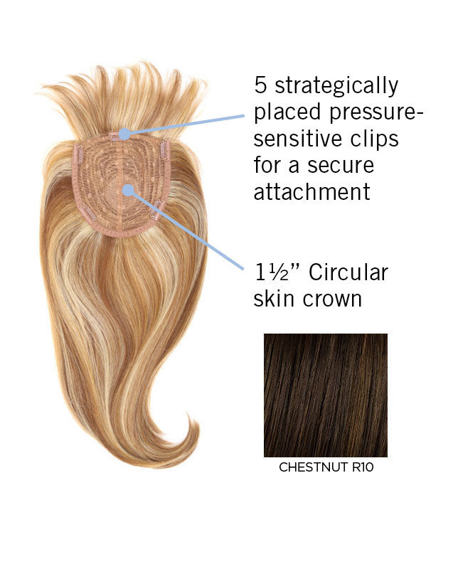 Join the bang club in this full on fringe. This top of head piece has bangs with length and volume to create the ultimate end result. Whether you want coverage or a bang, this piece changes your entire look with just a few clips. Straighten the Tru2Life® heat-friendly synthetic hair or add some waves and curls. We’ll leave the styling up to you! Hair Lengths: Front – 4 ½”, Crown – 16”, Side – 18”, Back – 18” 1½” circular skin crown on a 5” x 5 ½” base with 5 strategically placed pressure-sensitive clips for a secure attachment.