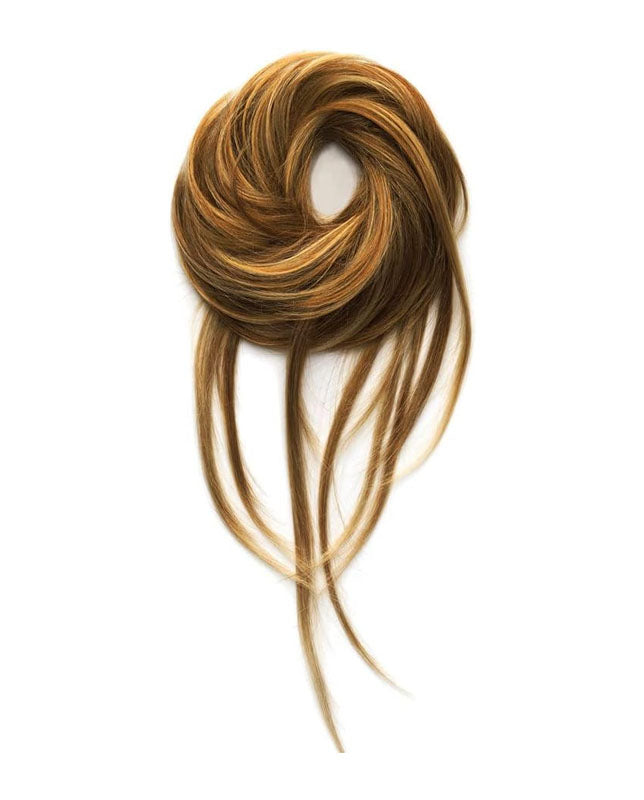 Trendy-Do Hair Wrap Color R1416T BUTTERED TOAST - Hairdo Up to 13" Long Tru2Life Heat Friendly Elastic Band Synthetic Updo Hairpiece. Hairdo's special Tru2Life heat-friendly synthetic hair can be flat ironed, curled or blown dry using thermal styling tools up to 350?F/ 180?C. Unlike your own hair, Tru2Life fiber only sets after it cools. So keep the curl shape until it’s cool, then release! Model shows R10 CHESTNUT, but the listing is for R1416T BUTTERED TOAST. Create many looks - updo, chignon, wavy wrap or a piece-y pony. The Trendy-Do by hairdo has this versatile, patented hair wrap on an elastic band consists of various lengths of hair from 5 ½" to 13” and features cascading tendrils.