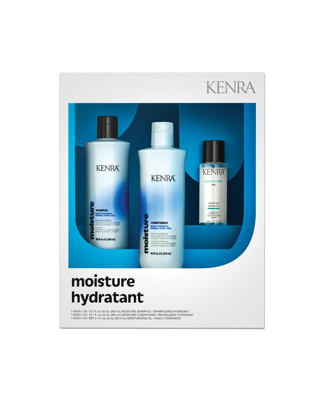 The Kenra Hydrate 3 pack kit includes the Kenra Moisturizing Shampoo and Conditioner 300ml each and the Moisturizing Oil 80ml. For your most nourished look: Cleanse & condition with Moisturizing Shampoo & Conditioner. Moisturizing Oil through damp or dry hair before your favourite Kenra style products for added hydration.
