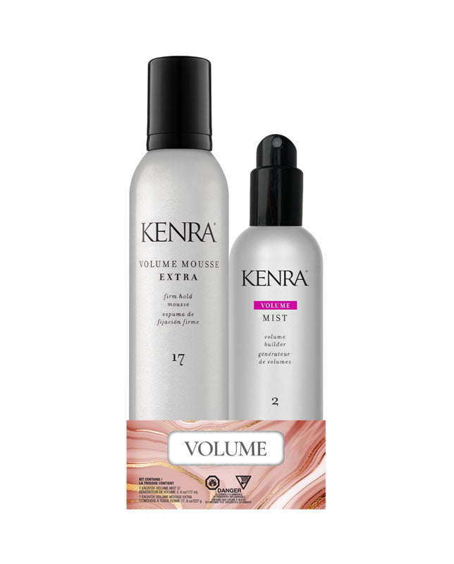 Kenra Volume Duo includes the Volume Mist 6oz and the Kenra Volume Mousse Extra 8oz. Volume Mousse: Kenra Volume Mousse Extra 17 is a firm hold, lightweight mousse that provides style and control without stiffness or stickiness. Rich formula spreads easily through the hair to provide maximum body and fullness. Volume Mist: Kenra Volume Mist 2 offers buildable, flexible volume making it simple to create lived-in styles. Joining the Kenra family of volume favorites as a true layering product, Volume Mist 2 pairs well with any of their finishing stylers, plus delivers thermal protection and enhanced shine.