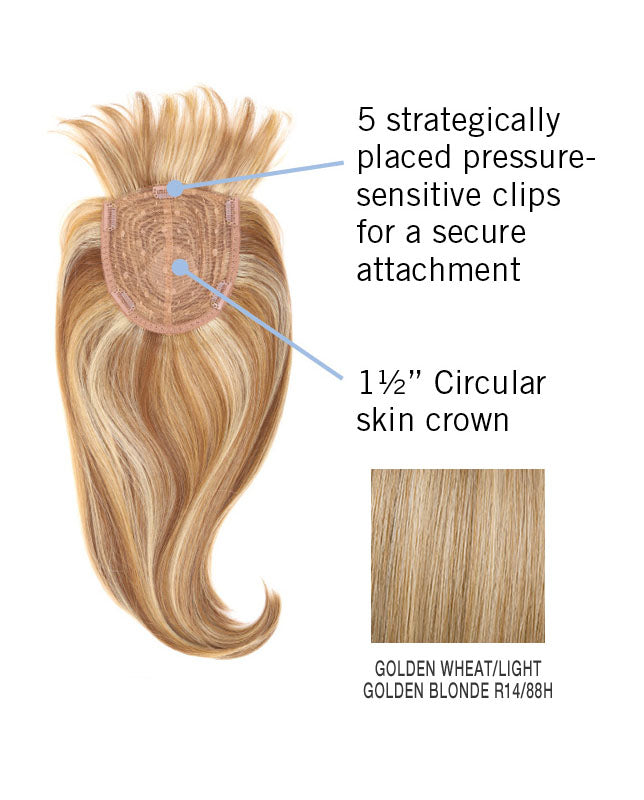 Join the bang club in this full on fringe. This top of head piece has bangs with length and volume to create the ultimate end result. Whether you want coverage or a bang, this piece changes your entire look with just a few clips. Straighten the Tru2Life® heat-friendly synthetic hair or add some waves and curls. We’ll leave the styling up to you! Hair Lengths: Front – 4 ½”, Crown – 16”, Side – 18”, Back – 18”. 1½” circular skin crown on a 5” x 5 ½” base with 5 strategically placed pressure-sensitive clips for a secure attachment.