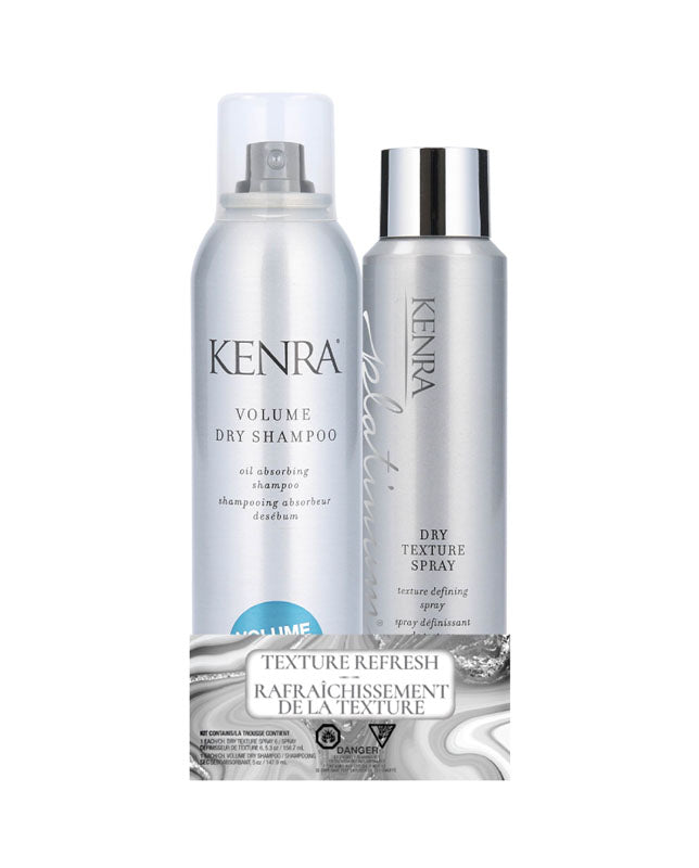 The Kenra Holiday Texture Refresh Duo includes the Kenra Platinum Dry Texture Spray 6 156.7ml & the Kenra Volume Dry Shampoo 147ml.